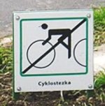Zamračeným ránem jsem se blížila k ústí opravené cyklostezky. Nových značek jsem si všimla již z dálky. A hned u první jsem byla trochu zmatená. Nedalo se z ní vyčíst, mám-li pokračovat rovně, nebo zahnout doleva a poté ihned doprava (což byla správná varianta). Vytáhla jsem foťák a začala stezku dokumentovat. Po chvíli jsem si všimla zcela nových značek až u země. Označovaly přechod z chodníku na stezku. Něco podobného jsem nikdy neviděla.Zaujala mne hlavně barva značky – byl na ní zelený přeškrtnutý cyklista. Později jsem se dozvěděla, že barva i směrování značky je špatně, nezbývá doufat, že se oboje časem změní. Během focení ke mně přišly dvě starší paní a začaly vyzvídat. Prý jestli si taky fotím to zbytečné vyhazování peněz. Proč se prý vyhazuje tolik peněz na dlážděnou cestu – po které se jim špatně chodí – zatímco cyklisté si budou jezdit po asfaltce.