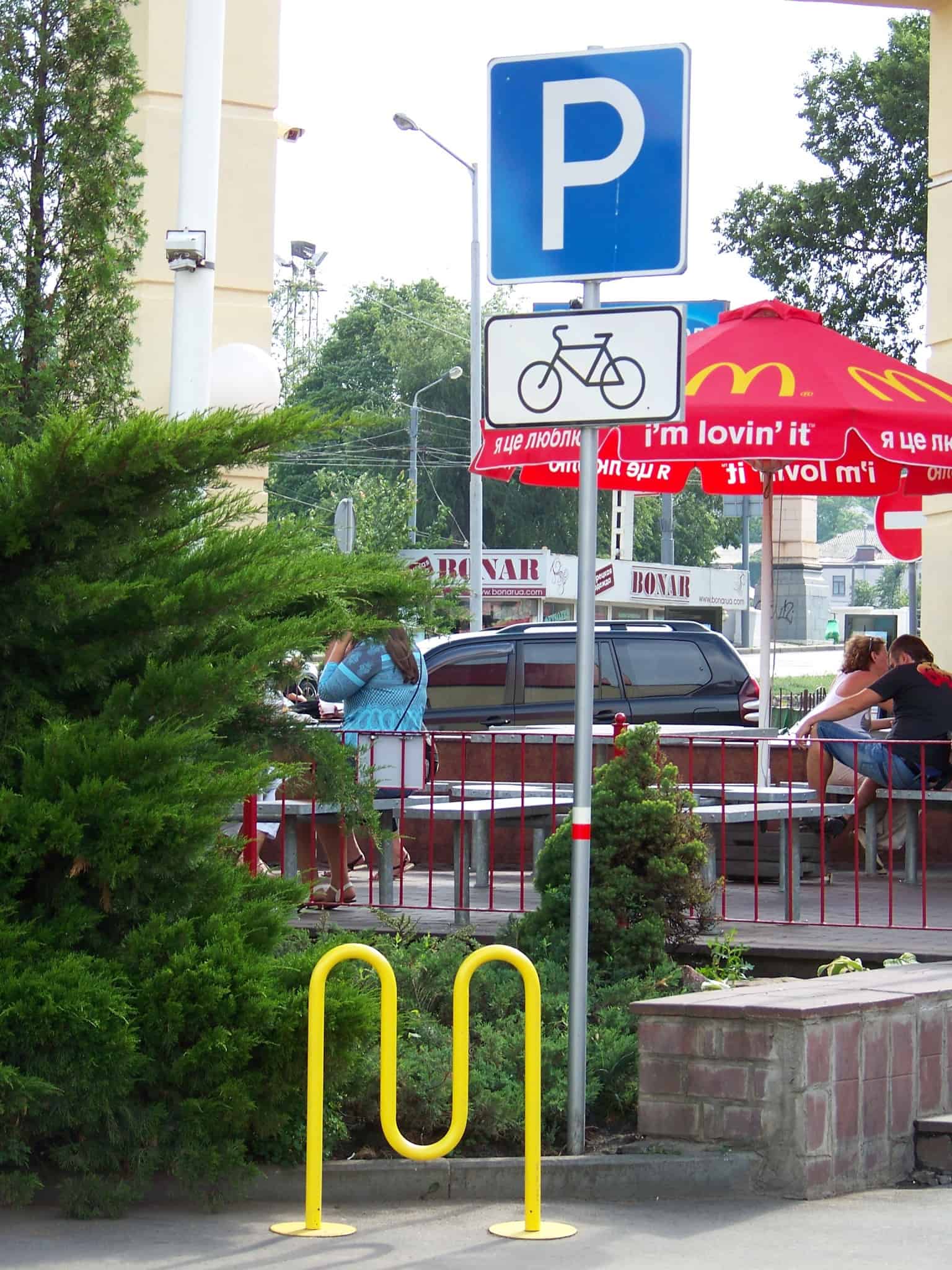 Cyklistických stojanů, především těch nainstalovaných městem, je po ukrajinských městech jako šafránu. U obchodů se čas od času vyskytují stojany nevalné kvality. O to víc mě překvapila kvalitní „dvojitá účka“ přítomná u většiny provozoven Mc Donald, provedením dokonce připomínající úvodní písmeno firmy. Uvnitř další provozovny jsem viděl i zaparkovaná kola zaměstnanců.