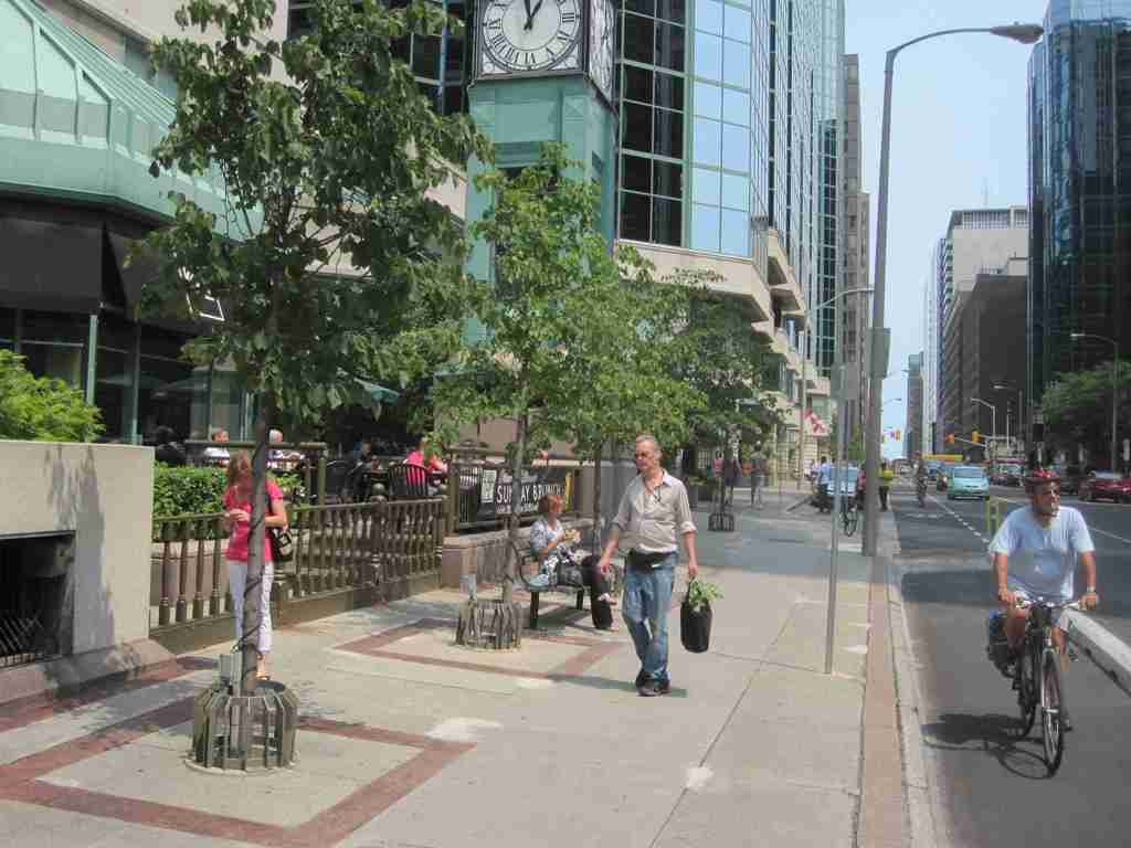 V hlavním městě Kanady byl v červenci 2011 zrealizován cyklopruh skrz centrum města, v trase, která svým významem (i když ne charakterem) odpovídá pražskému Smetanovu nábřeží. Došlo zde k propojení slepých konců nejdůležitějších cyklostezek vedoucích do centra v jeden funkční celek. Tedy to, na co Praha zatím čeká (vytvoření pěší zóny mezi Karlovým mostem a Národním Divadlem můžete podpořit zde). Velmi zajímavé je pak provedení pruhu, od aut jej oddělují betonové obrubníky a parkování. Pruh je navíc doveden až ke křižovatkám a zeleně podbarven při jejich průjezdu.