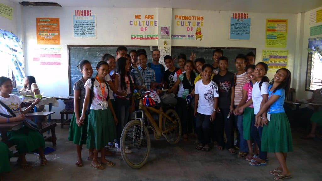 Jo. Von mě vzal do těch škol, kde jsem inspiroval ty děti, aby si založily byznys na bambusu. Ten je totiž zadarmo a to kolo se nechá prodat za deset dvacet tisíc, což jsou pro ně neskutečný prachy. Na střední škole mají od osmi do odpoledne různý předměty, takže vlastně jako u nás. Přijde mi ale, že ty děti byly uvolněnější, bezprostřednější a že měly blíž k učitelům. Větší pohoda.