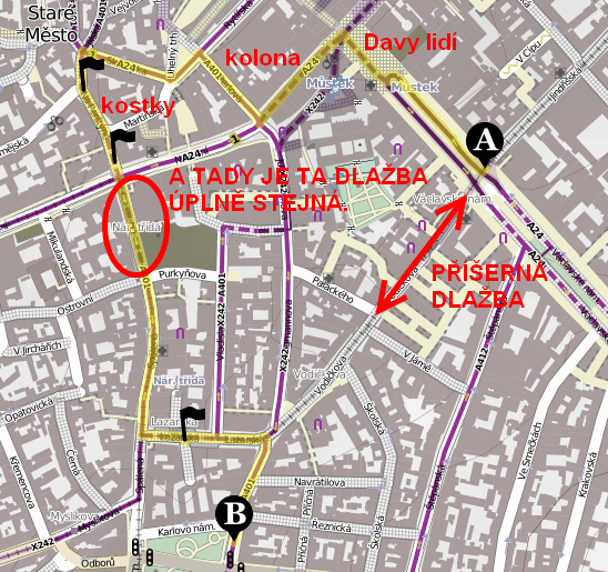 Současně se jedná se o významné cyklistické propojení. Chcete se legálně dostat z Václavského na Karlovo náměstí a vyhnout se kopci, vedení kola i této strašlivé dlažbě? Zajedete si 900 metrů a u metra Národní třída narazíte na stejně odporné kostky. Nebo můžete kolo strkat po přelidněných chodnících Vodičkovy či Jungmannovy. „Kvalitu“ objízdné legální trasy (bez chodníkových úseků) vystihuje následující obrázek: