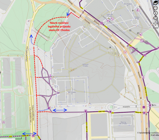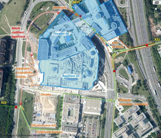 Při rozšiřování OC Chodov byl zajištěn a rozšířen legální průjezd na kole k novému západnímu vchodu. U výstupu z metra byla zřízena pěší zóna s omezením rychlosti jízdy cyklistů na 15 km/h, což je velmi dobré řešení. OC Chodov se také snažilo zpřístupnit cyklistům legálně svůj západní vchod a tak je zde celá pochozí zóna legalizována pro jízdu na kole, a byly zde zřízeny použitelné stojany. Navíc se legalizovala zkratka odstraňující závlek trasy A22 k poliklinice Šustova.