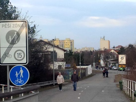 Na fotografii vidíte, že značení původní „dvacetikilometrové“ zóny zůstalo na místě. To je zcela nadbytečné, zvlášť proto, že do slepé ulice před začátkem zóny je zákaz vjezdu mimo dopravní obsluhy. V opačném směru je značení ještě chaotičtější, protože patnáctikilometrová zóna zde přechází do režimu cyklostezky a následně končí dvacetikilometrová zóna. Předpokládám, že staré značení mělo být odstraněno, ale nakonec na to nedošlo. (poznámka: část fotografií v článku je z loňského podzimu, ale v polovině března jsem si platnost vyfotografovaného stavu znovu ověřil).