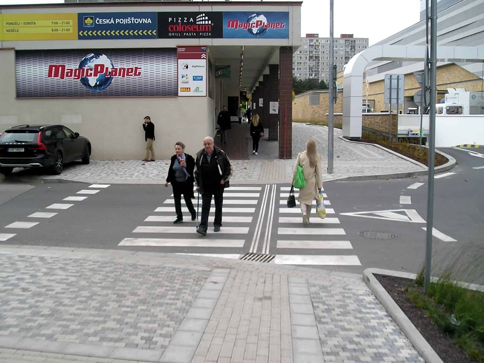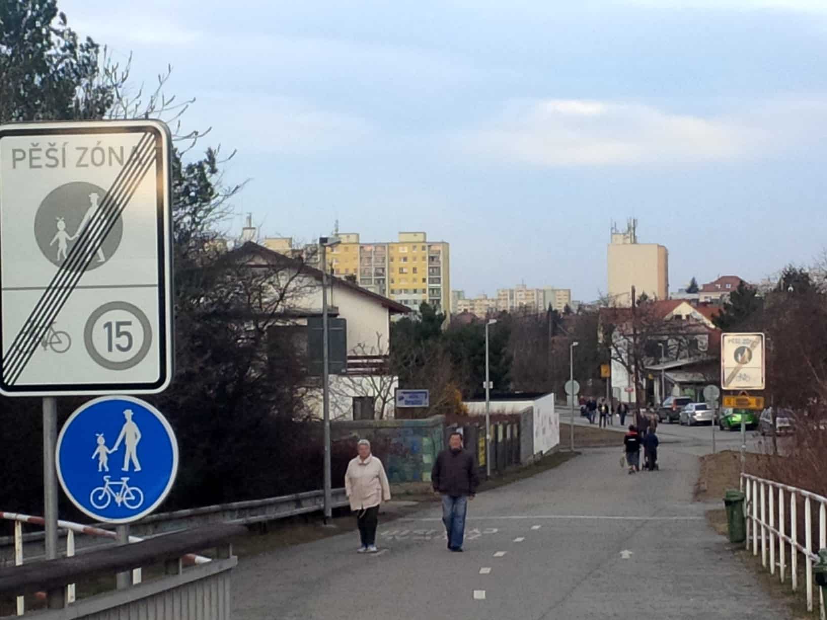 Dřívější nefunkční dělená stezka po frekventovaném chodníku k ulici V Parku je nově řešena jako smíšená, do dlažby se nicméně nezasahovalo. Již neplatné piktogramy tak patrně zmizí teprve ošlapáním, což ale nebude dlouho trvat.