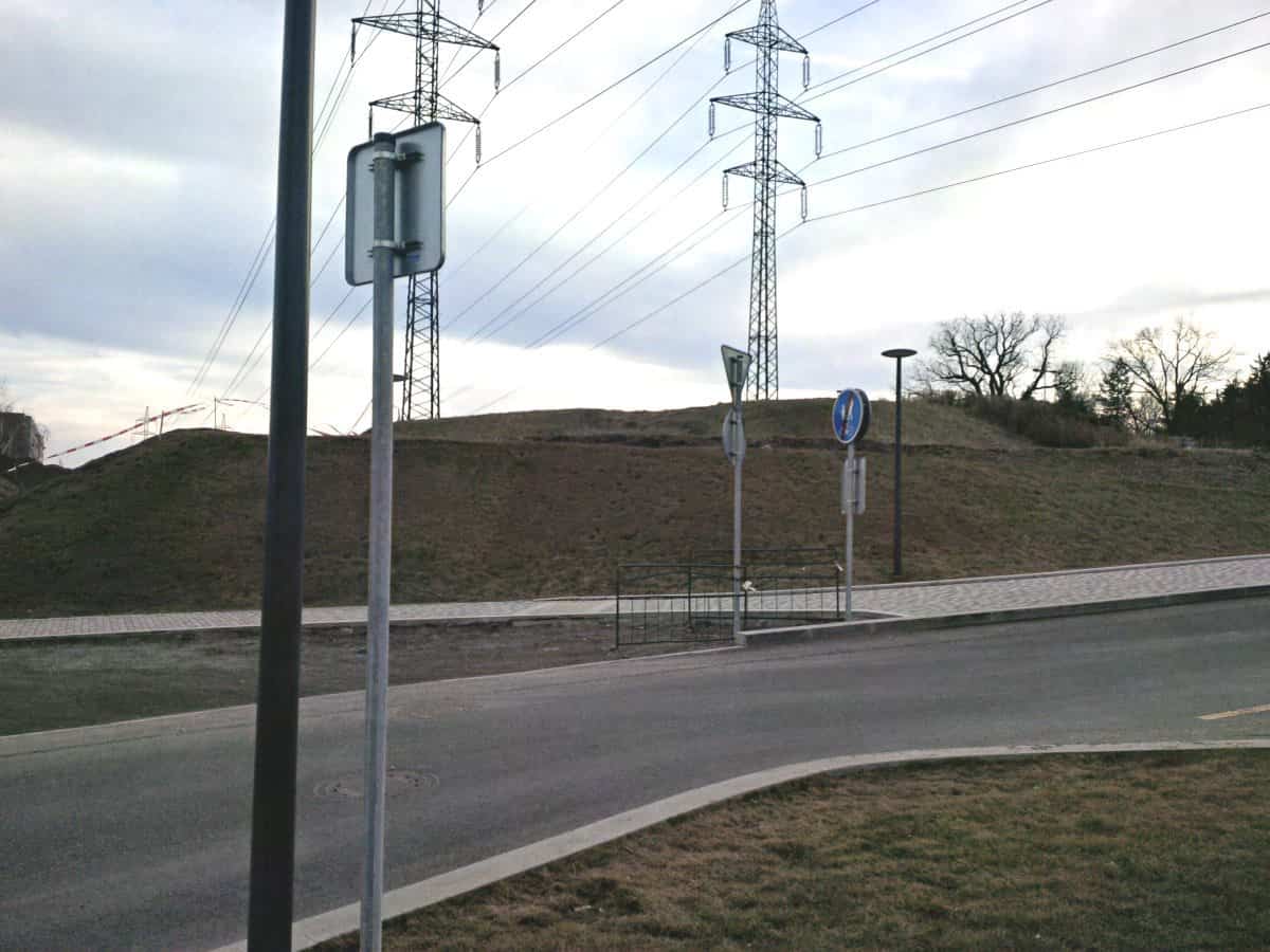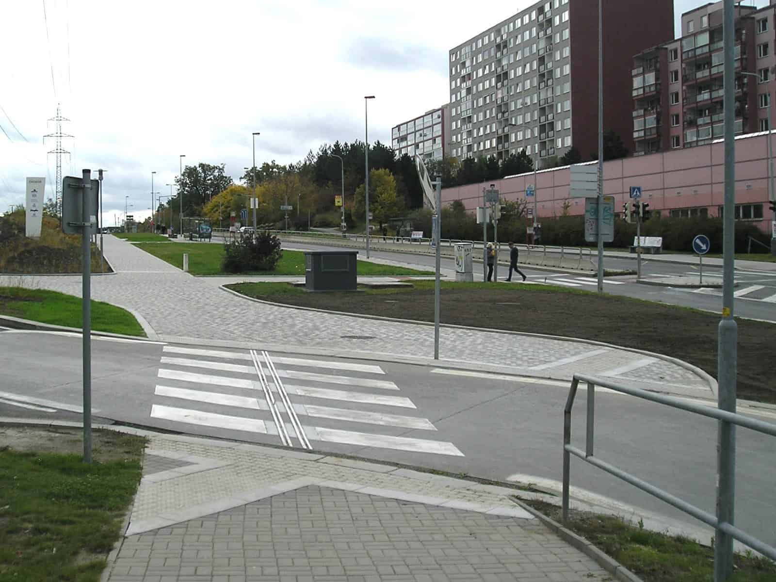 Místo není vyřešené zrovna nejlépe, na ukončení stezky chybí snížená obruba a musí se zde proto jezdit přes přejezd pro cyklisty. Místo ale prochází stavebními úpravami, právě zde bude příjezd do staveniště ve zbývajícím volném prostoru a tak se zde situace bude ještě měnit – viz foto stejného místa z března (bráno od přejezdu):