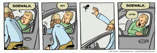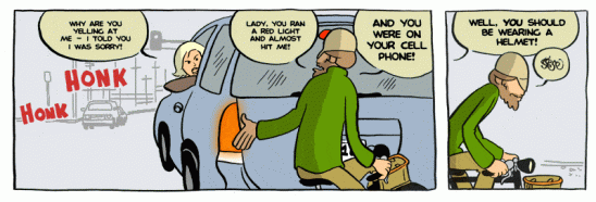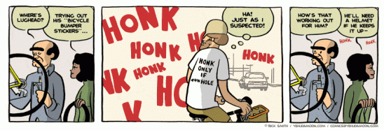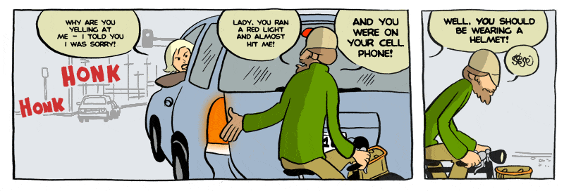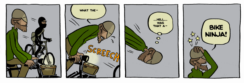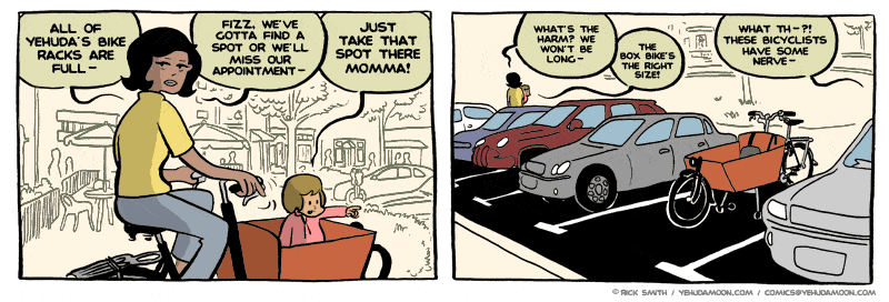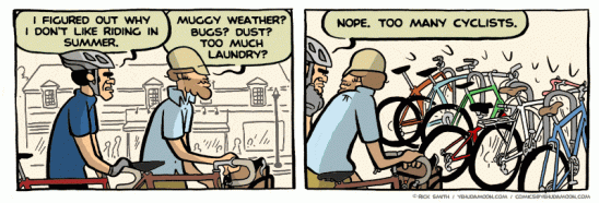 Nepopírám, že jde o komiks, který mne dlouhodobě těší. Najdete zde stovky denních stripů z prostředí malého obchodu s jízdními koly, ve kterém společně pracují trochu cykloaktivistický Yehuda a silničkář Joe, takoví „jing a jang cyklistiky,“ dost odlišní na dobrý sitkom, sdílející ale lásku k jízdním kolům. Komiks ale představí i několik pěkně těžkých příběhů (zejména ten první, o ghostbiku – ale, kdo neznáte, raději bez spoilerů). Můžete se probírat stripy od začátku a budete mít na několik dnů vystaráno.