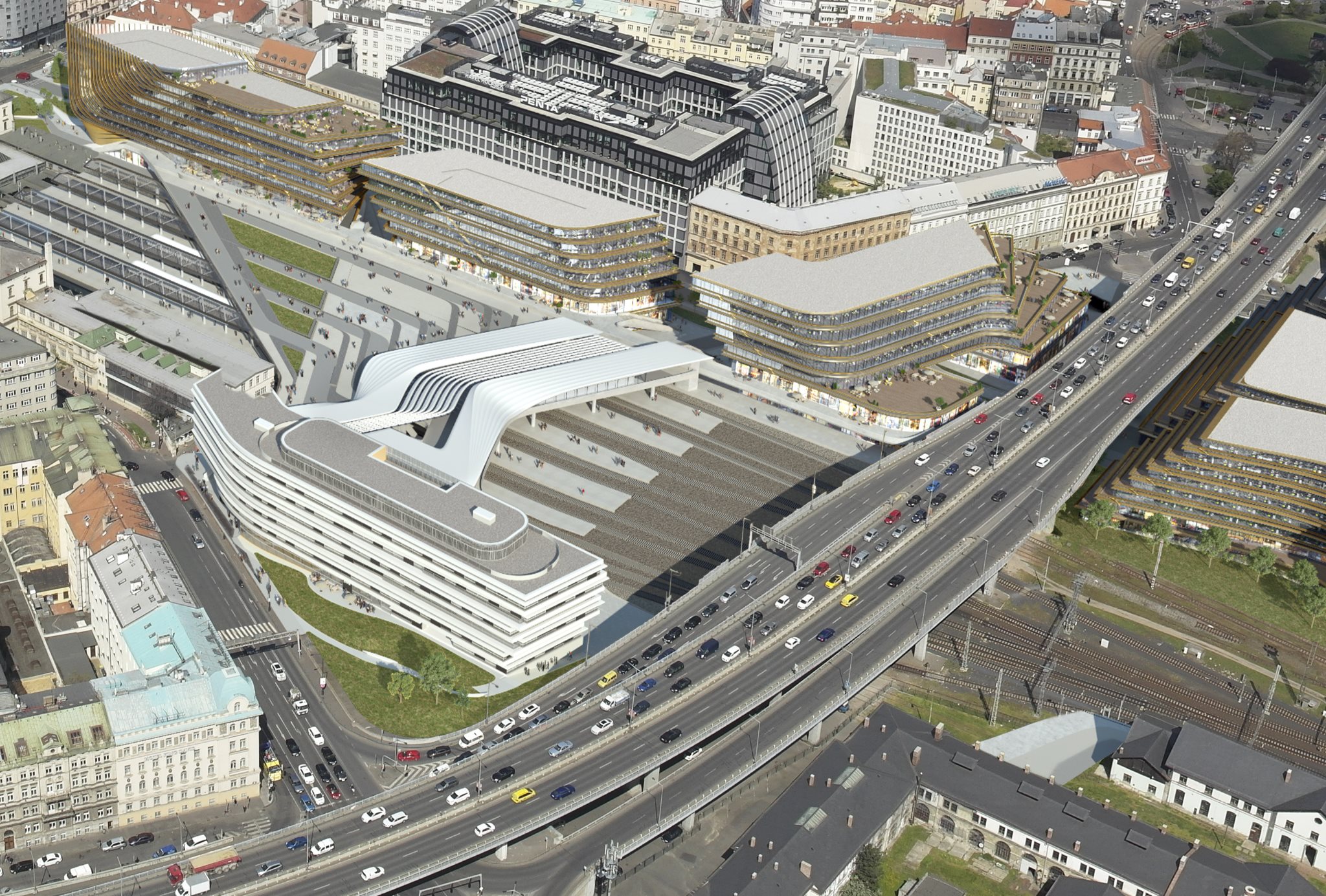 Vizualizace Penta. Cyklotrasa A410 je v celoměstském systému vedena z ulice Opletalovy (na obrázku zcela vlevo) do rohu ulice Na Florenci (na obrázku za vizualizovanými budovami), a to v místě přemostění nádraží tou hladkou pasáží.