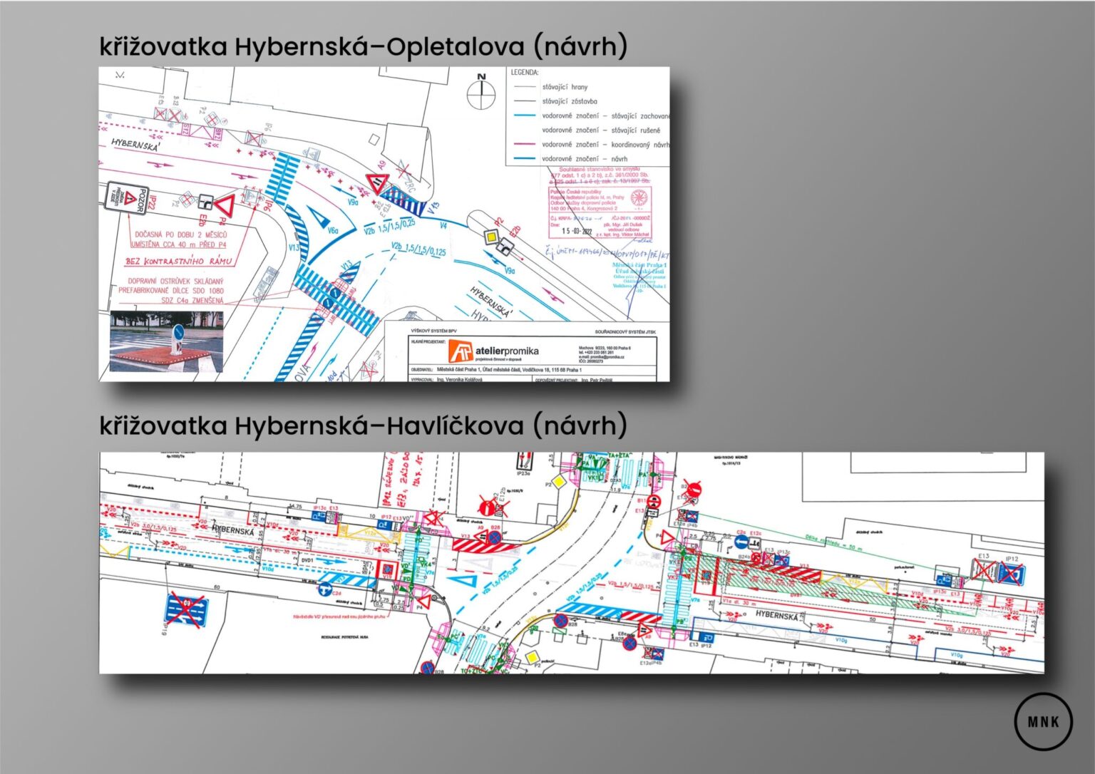 Reálně dnes vypadá jízda Opletalkou, Hybentnou a Příkopy děsivě na kole, koloběžce i autem. Viz www.horydoly.cz/cykliste/hororova-doprava-v-hybernske-ulici.html