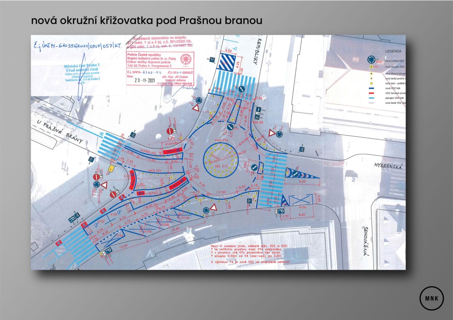 Součástí novinek v dopravě je také nový kruhový objezd před Prašnou branou, z něhož bude možné odbočit na cykloobousměrky U Prašné brány a Na Příkopě.