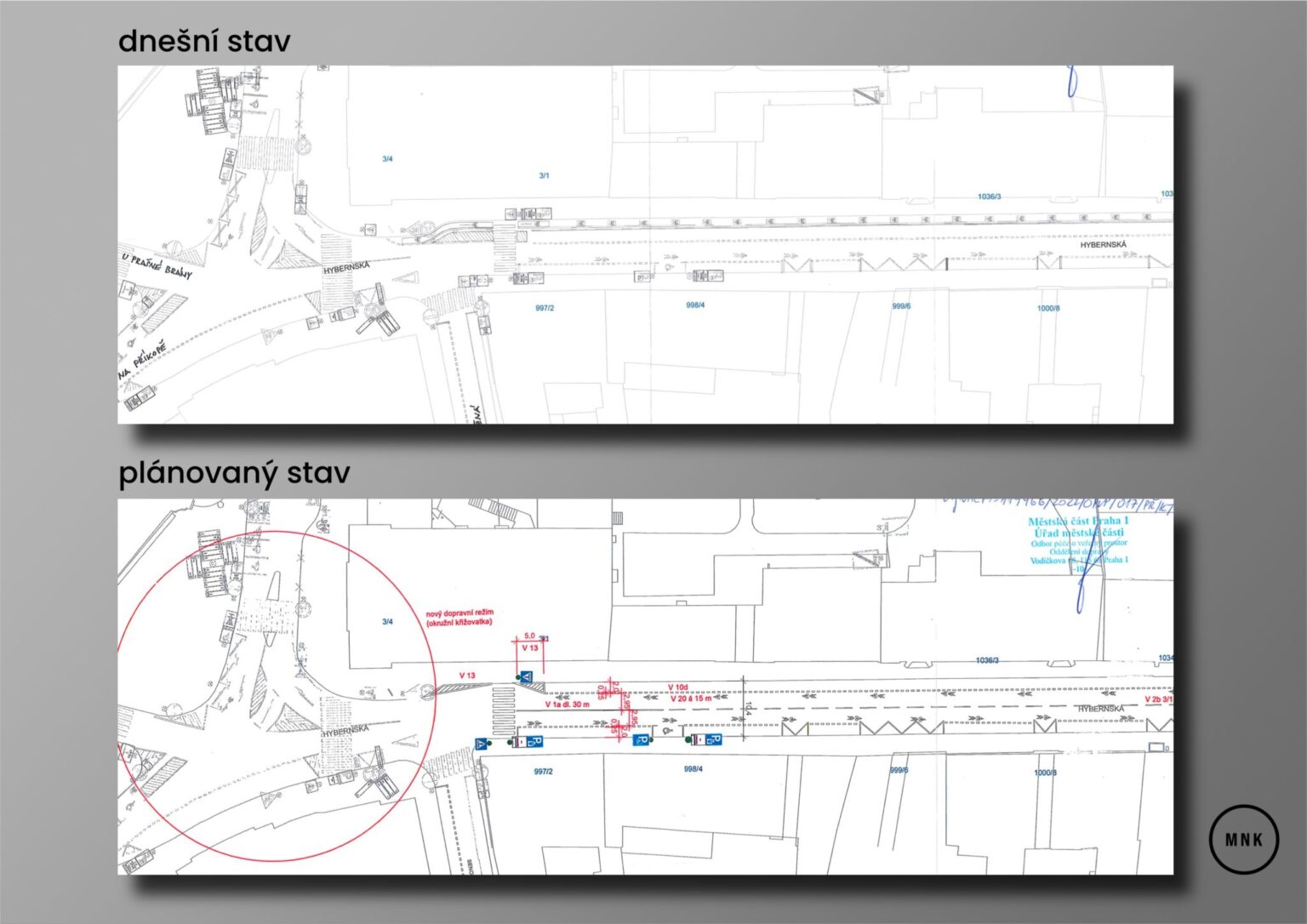 Změny se dotknou téměř 500 metrů dlouhého úseku Hybernské mezi Opletalovou ulicí a Prašnou bránou. Zde se na rušený cyklopruh posunou parkovací místa, čímž vznikne pruh pro obousměrný provoz aut. Lidé na kolech místo cyklopruhu budou muset jet mezi auty – uprostřed vozovky je povede cyklopiktokoridor.