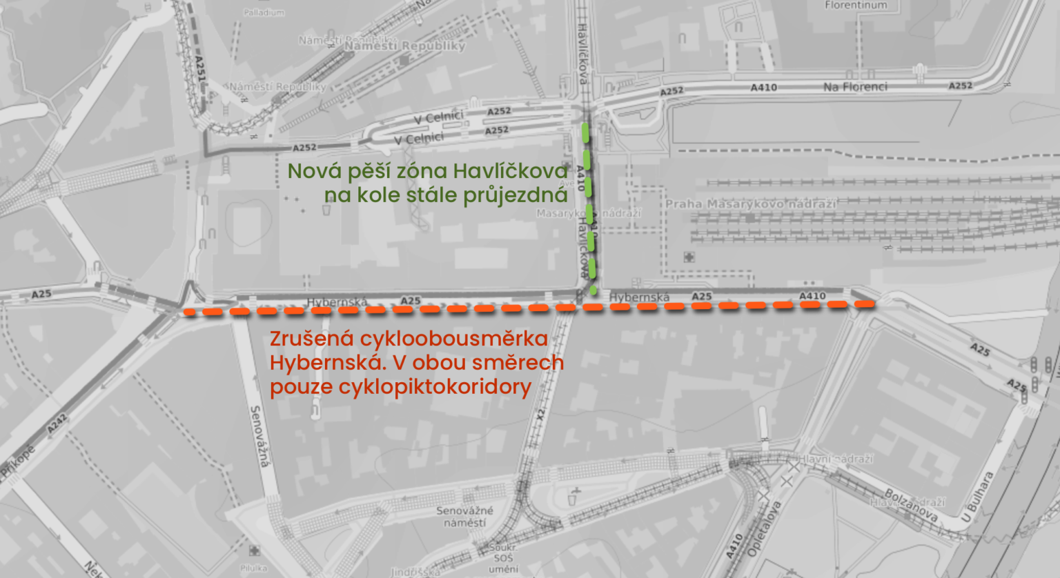Praha 1 na letošní jaro připravuje velké změny v dopravě. Z části Havlíčkovy ulice před Masarykovým nádražím bude pěší zóna, čímž se zamezí průjezdu aut. V souvislosti s tím městská část pro auta zobousměrní celou Hybernskou ulici. Ruší se tak protisměrný cyklopruh za řadou zaparkovaných aut, který vznikl v roce 2015. Nahradí ho cyklopiktokoridor ve vozovce.