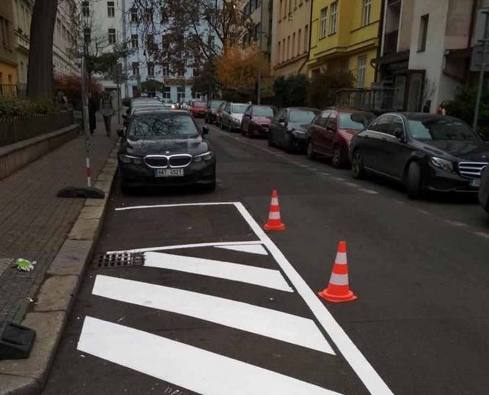 Praha 2: "Jakoby jo, ale nemůžem to dát úplně před přechod, nebylo by přes to vidět. Dejme to o kus dál." -> výsledek na obrázku