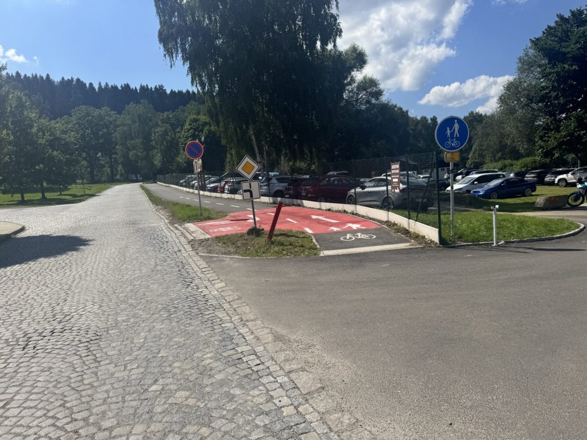 Asi v teto lunaparkove casti Sumavy (s mnoha turisty) zcela pochopitelne (a oddeleni od aut je skutecne potrebne), opet o neco sirsi, nez o kousek dal smerem na Predni Vyton. Musim podekovat tem, kteri nepodlehli soucasnemu trendu udelali cyklostezku v jine casti Sumavy jinak: https://mapy.com/s/humonosaje -- i tahle je take alespon z poloviny asfaltova, ale v mensi sirce, pocit, ze jedete po dalnici, neni tak silny. Nebo, ze treba nevyasfaltovali cestu kolem Vchynicko-Tetovskeho kanalu a je prijemne tam vyrazit i bez kola.