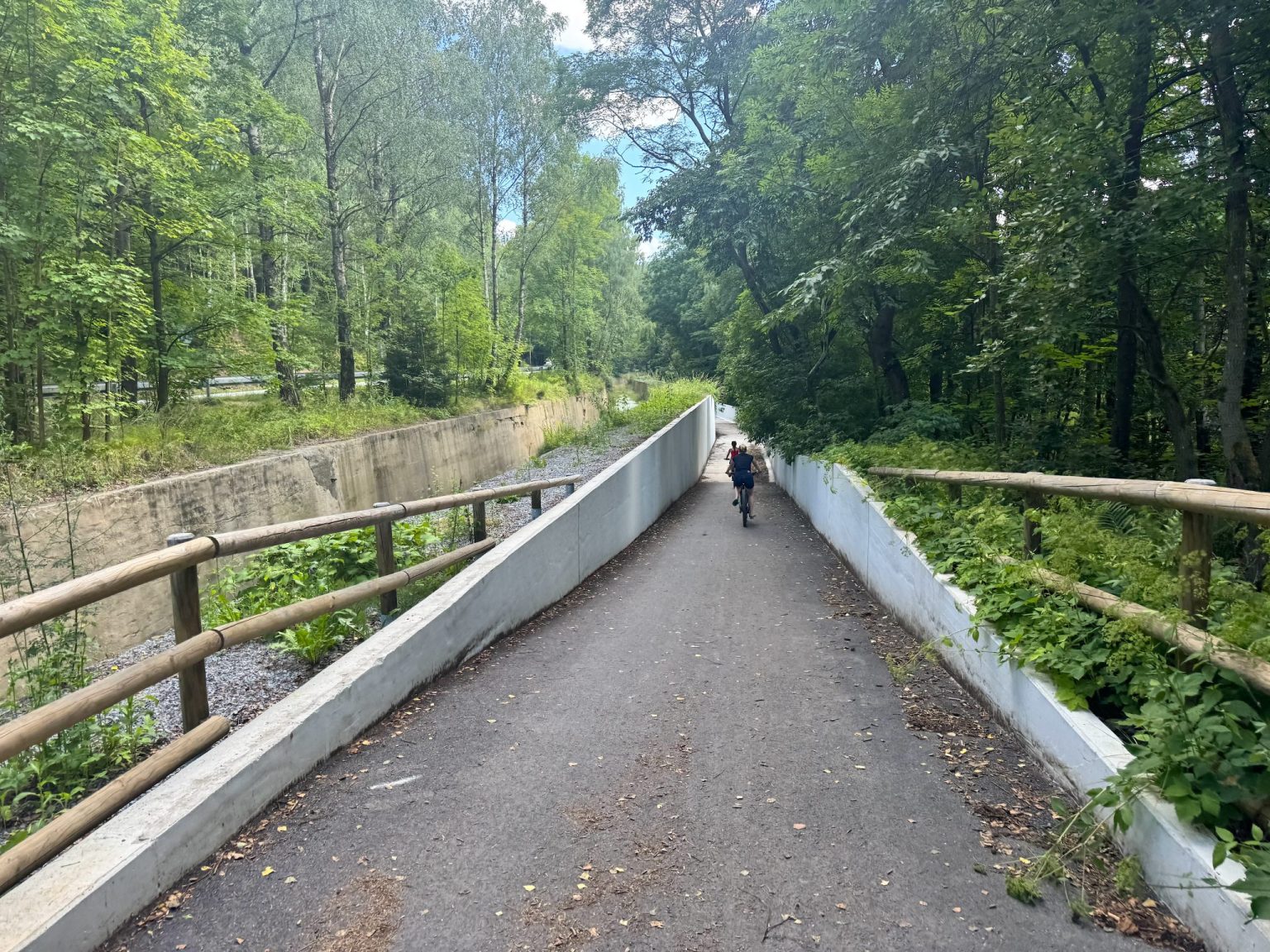 Úsek vedený bývalým vodním kanálem je unikátním zpestřením trasy, zajímavým nejen technicky, ale i architektonicky. Kdo hledá výlet na kole v kombinaci s historií místní infrastruktury, může si zdejší trasu vyzkoušet. Na fotografiích níže se můžete podívat, jak průjezd zapuštěným korytem vypadá v praxi.