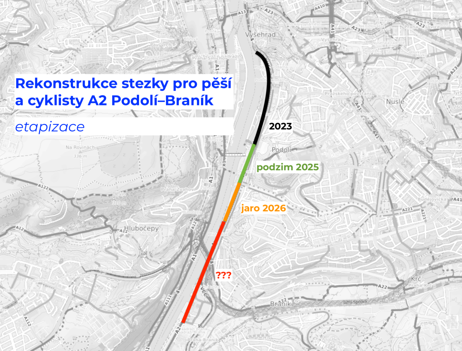 Po dokončení aktuální etapy v délce 550 metrů naváže město na jaře 2026 rekonstrukcí dalšího 400metrového úseku mezi Žlutými lázněmi a čerpací stanicí MOL. Po dokončení tak bude mít Praha 900 metrů nové stezky A2 včetně širšího profilu, nového povrchu a lepšího značení.