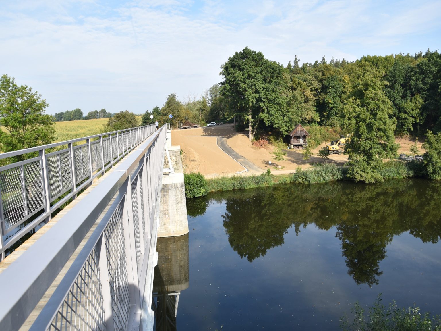 Nová konstrukce vznikla na pilíři bývalé důlní vlečky, který stál uprostřed Radbuzy desítky let. Na trase vlečky vznikla i navazující stezka. Právě na pilíři mostu stála populární „chaloupka na pilíři“ přezdívaná „Chaloupka baby Jagy“. Tu místní mladí lidé postavili začátkem 90. let, během covidu se stala turistickým fenoménem, ale v roce 2022 ji nechali filmaři záměrně shořet při natáčení snímku Citlivý člověk.