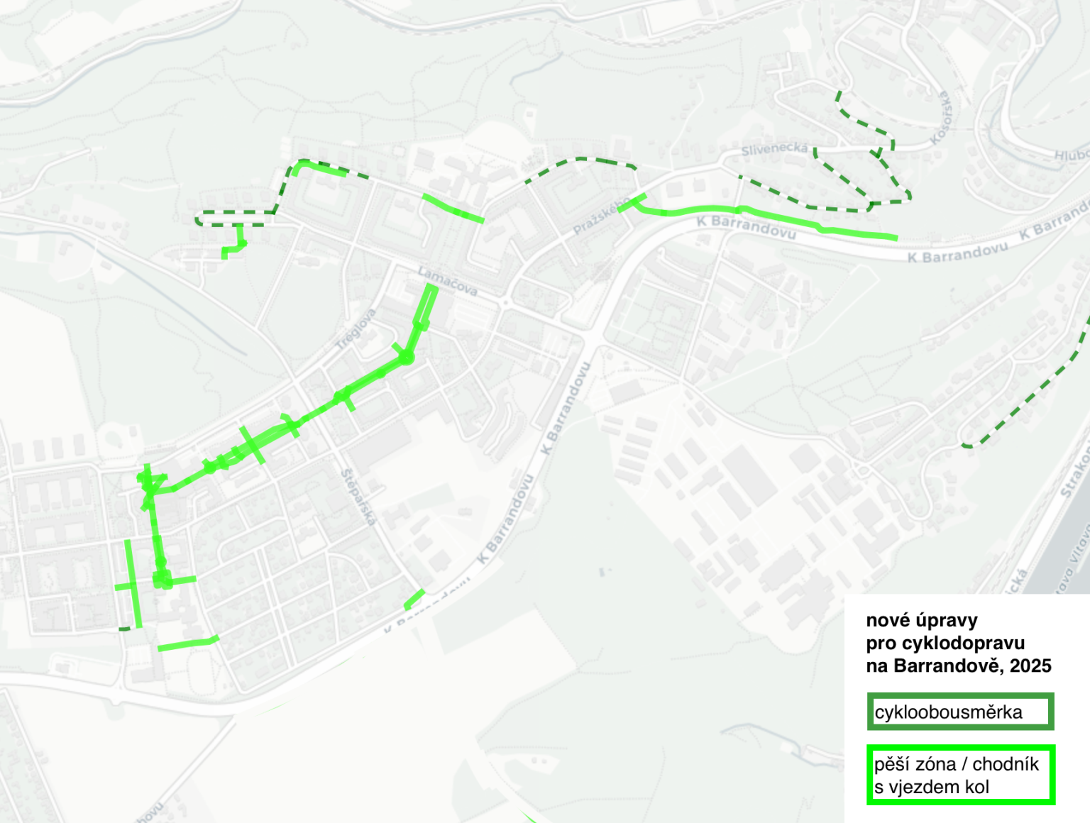 Na pražském Barrandově byla dokončena opatření, která umožňují bezpečnější pohyb cyklistů a pěších po sídlišti. V několika jednosměrných ulicích vznikly cykloobousměrky, v dalších byla povolena jízda kol po chodnících nebo pěších zónách.
