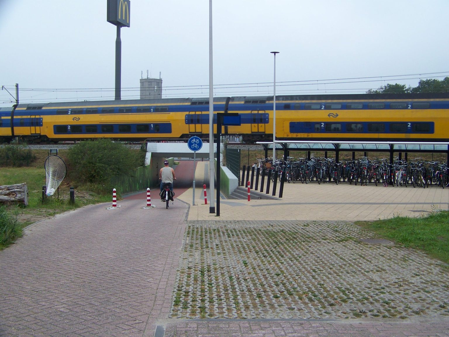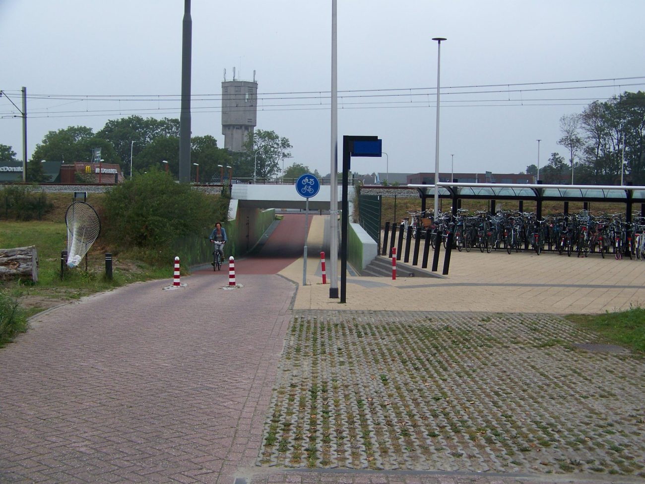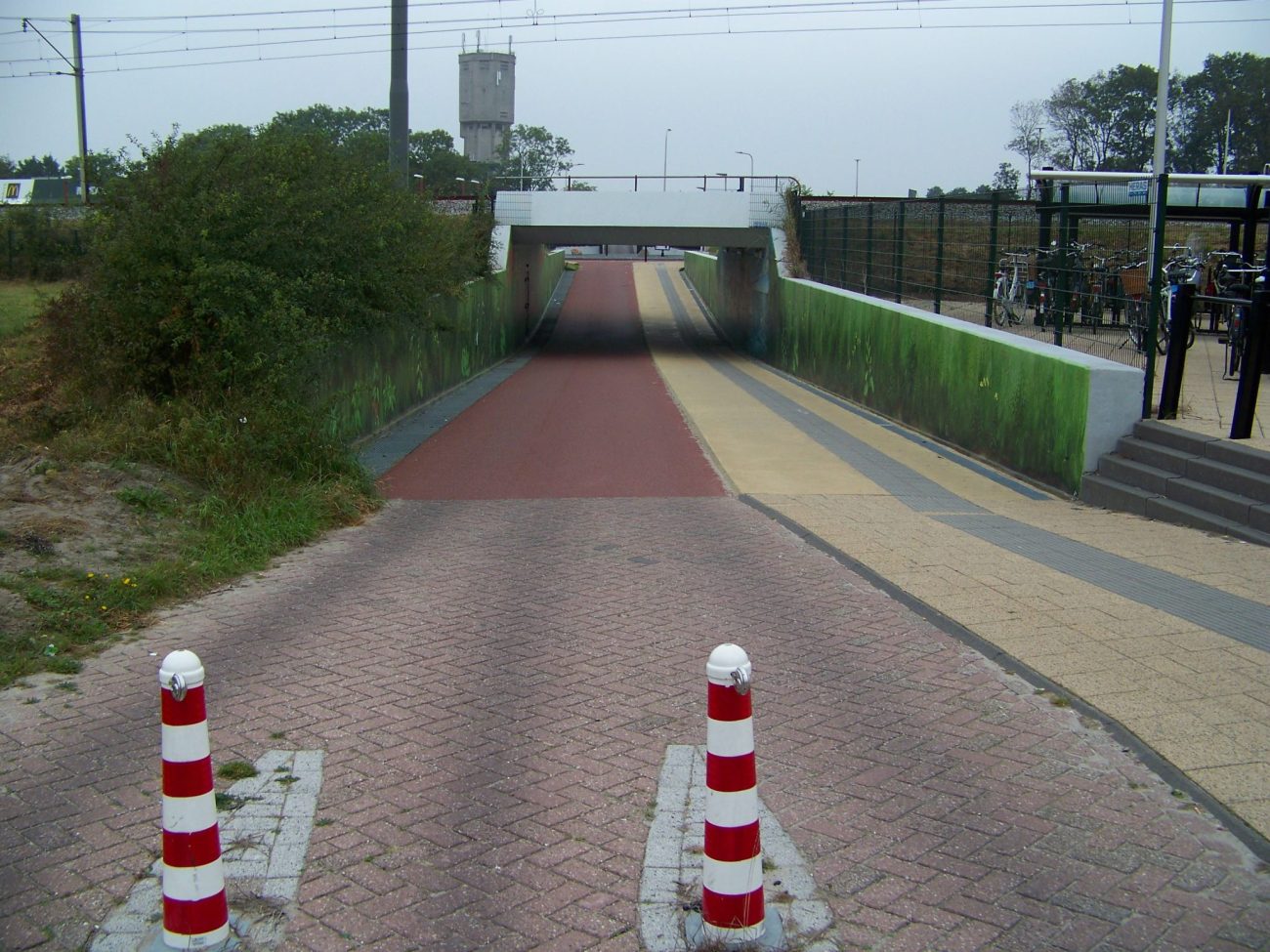 Druhá galerie je z okrajové části města Sassenheim. Na Google streetview je cyklopodjezd zachycen v srpnu 2010 ještě jako podjezd komunikace (Wasbeeklaan) i pro auta. Patrně krátce poté podjezd repasovali a zamezili průjezdu aut. Na mých fotkách ze září 2014 je čtvrtek 10h dopoledne. Naplněnost cykloparkoviště u nové železniční zastávky, světlost podjezdu, šířka cyklostezky a chodníku, veřejné osvětlení, mírnost sklonu ramp – vše nepřekvapí. Také to, že rampy jsou trasované přímo a neprodlužují cyklistům a pěším vzdálenost. Na jedné straně železnice jsou pole, a na druhé dálnice a obchodně průmyslová zóna. Google streetview na straně města a dálnice zachycuje i novou situaci s cyklopodjezdem a cykloparkovištěm.