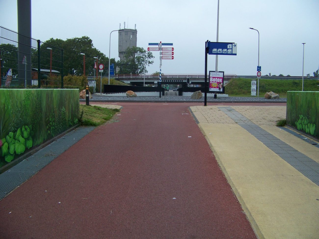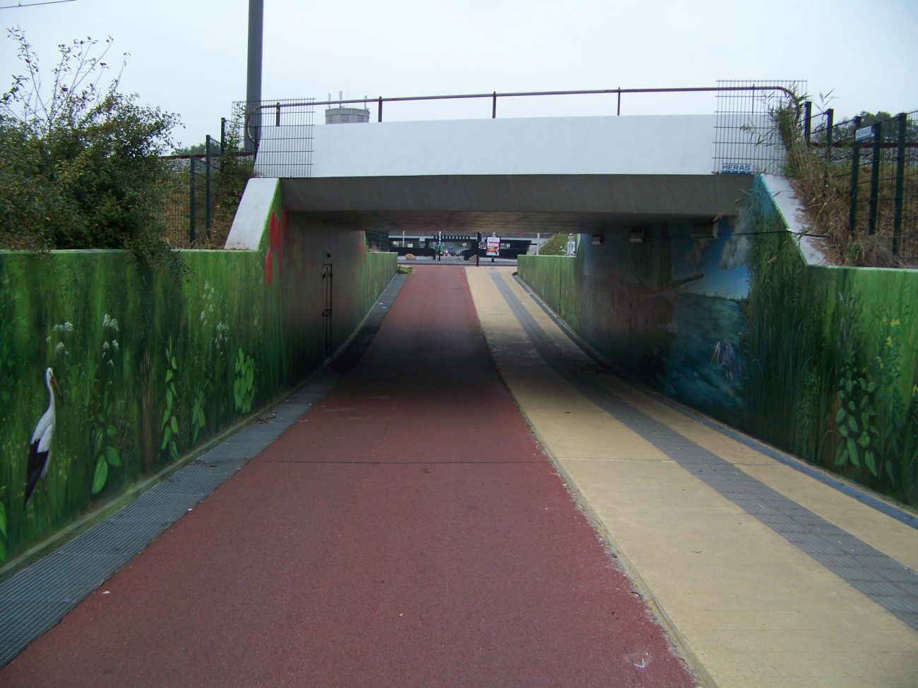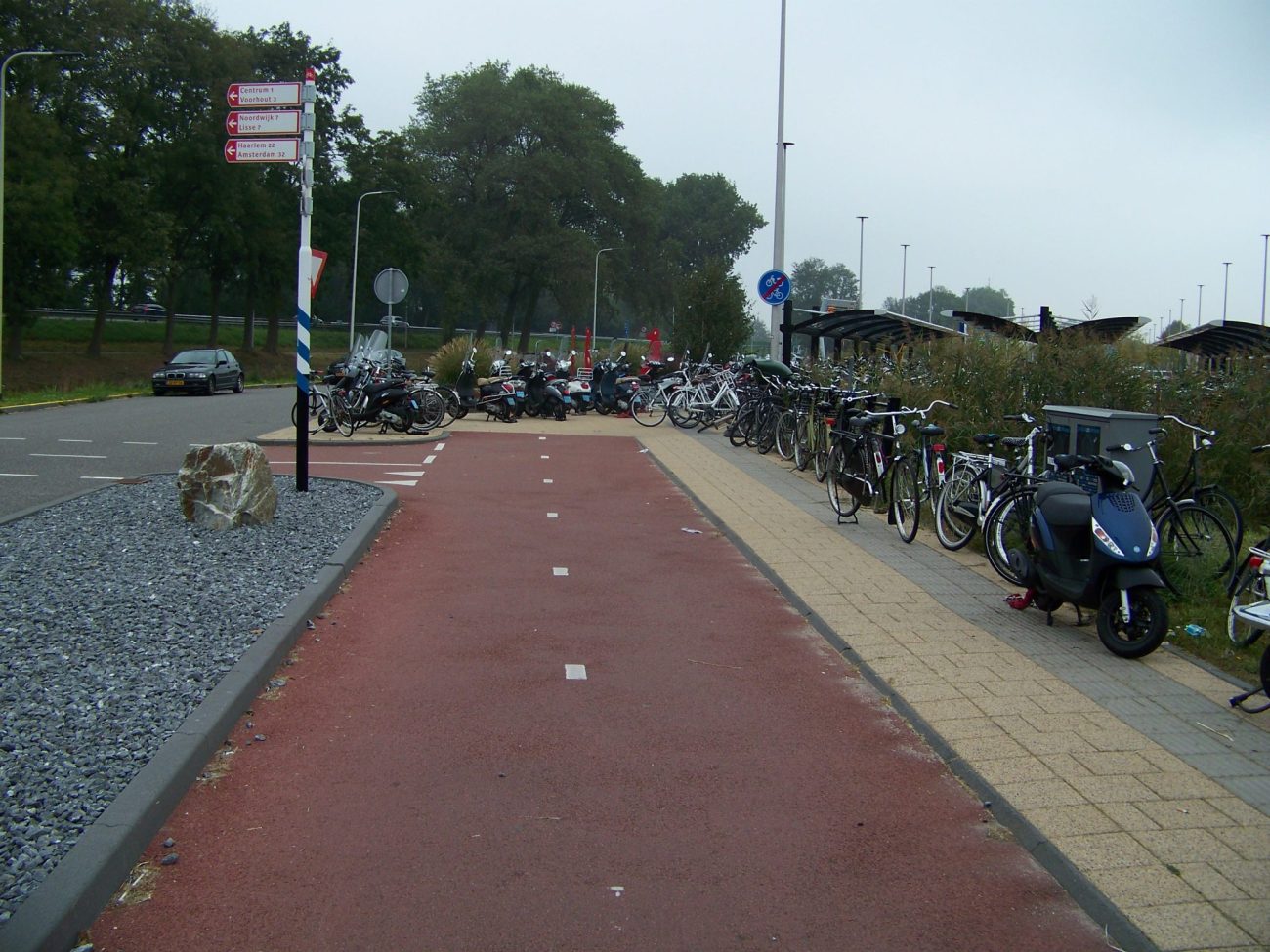 Druhá galerie je z okrajové části města Sassenheim. Na Google streetview je cyklopodjezd zachycen v srpnu 2010 ještě jako podjezd komunikace (Wasbeeklaan) i pro auta. Patrně krátce poté podjezd repasovali a zamezili průjezdu aut. Na mých fotkách ze září 2014 je čtvrtek 10h dopoledne. Naplněnost cykloparkoviště u nové železniční zastávky, světlost podjezdu, šířka cyklostezky a chodníku, veřejné osvětlení, mírnost sklonu ramp – vše nepřekvapí. Také to, že rampy jsou trasované přímo a neprodlužují cyklistům a pěším vzdálenost. Na jedné straně železnice jsou pole, a na druhé dálnice a obchodně průmyslová zóna. Google streetview na straně města a dálnice zachycuje i novou situaci s cyklopodjezdem a cykloparkovištěm.