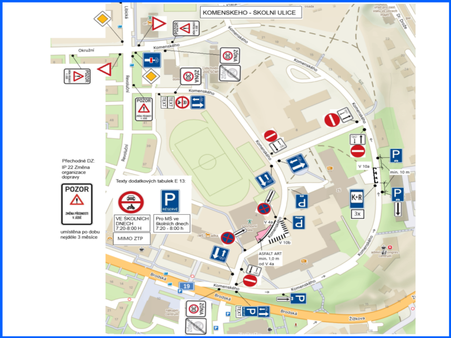 Součástí opatření bude zjednosměrnění ulice Komenského, která tvoří místní dopravní „okruh“. V ranní špičce mezi 7:20 a 8:00 zde bude zároveň platit zákaz vjezdu motorových vozidel, aby se snížil počet aut přijíždějících přímo ke škole.