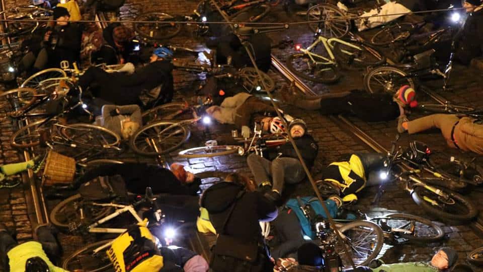 Cyklisté protestovali proti omezení průjezdu pěšími zónami – tentokrát vleže
