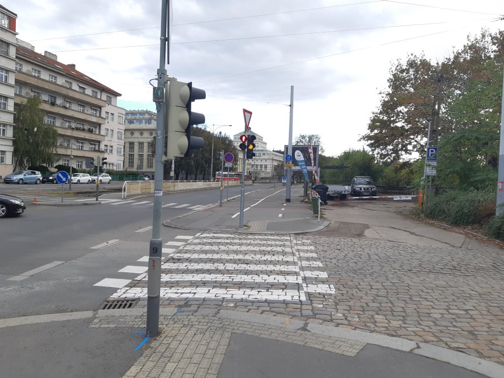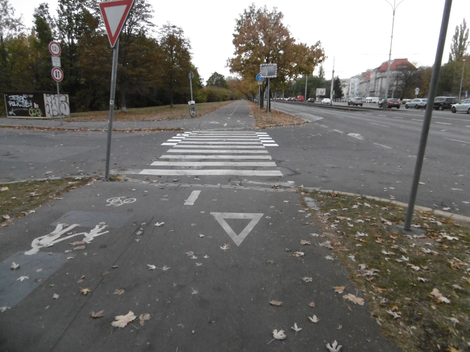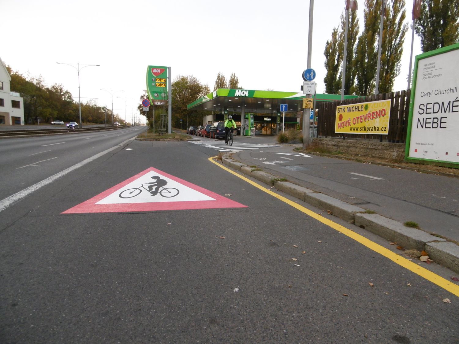 Možná by bylo lepší, kdyby jenom bývali byli sundali to slejzání z kola, bez vyznačení přejezdu. To by pak cyklisté jedoucí proti proudu řeky měli přednost zprava od vozidel na Podolskym nábřeží. (A ti jedoucí po proudu od vozidel od pumpy.) Což dává, podle mě, o dost větší smysl, protože takhle se cyklista jedoucí proti proudu musí ohlížet o 180° za sebe na tu silnici (Podolské nábřeží).