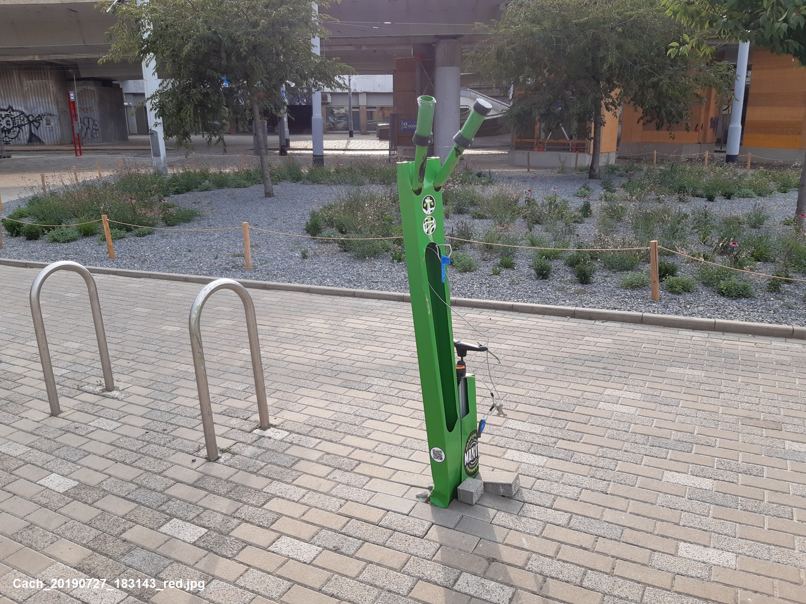 Tento pilotní servisní stojan na Vltavské byl ale v létě 2019 po přibližně roce provozu poničen, pravděpodobně nárazem automobilu. Nahrazený servisní stojan byl nově umístěn na druhý konec řady cyklostojanů, kde je pravděpodobně menší riziko jeho střetu s vozidly.