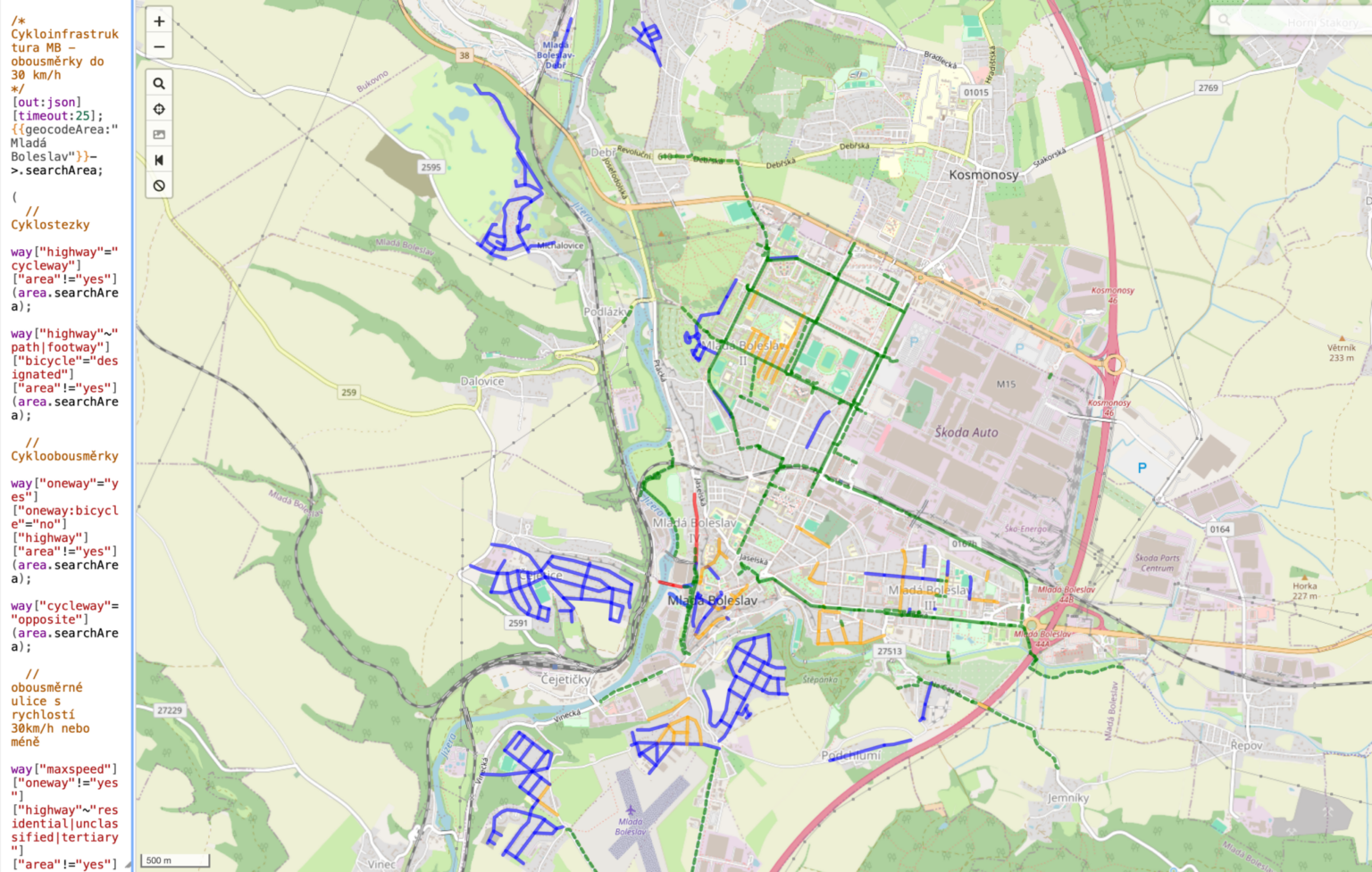 První skript zobrazuje cyklostezky, cyklopruhy, piktogramové koridory, cykloobousměrky i obousměrné ulice se zklidněným provozem do 30 km/h. Druhý se zaměřuje výhradně na cykloobousměrky: jednosměrky jsou v mapě zobrazeny modře, cykloobousměrky oranžově, přičemž skript zároveň počítá jejich počet přímo ve výstupu.